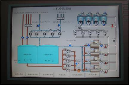 Sains designed and produced the control system. The system consists of a SIEMENS S7-300 PLC, a SIEMENS MP377 touching screen, Danfoss converters and Schneider low voltage electrical devices to control 2 ZUW400A5 water chillers, 3 37kw freezing pumps, 3 55kw processing pumps, one 15kw air conditioning pumps, 3 22kw high temperature tower pumps, and 2 groups of 11kw cooling tower.